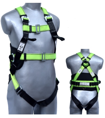 Cinturão de segurança tipo paraquedista confeccionado em fita sintética com proteção UV com 44 mm de largura na cor verde vivo para os ombros e na cor preto para as pernas. Equipado com indicadores de impacto – Equipado com fita de proteção sub-pélvica usado como assento para melhor conforto – Cinturão abdominal para posicionamento, acolchoado com argolas lateriais – Possui quatros pontos de conexão sendo um ponto dorsal em argola tipo “D” em aço, duas argolas tipo “D” laterais e um ponto duplo peitoral em fita de poliéster de 44mm ambos pontos para retenção de queda. Possui cinco fivelas duplas em aço, utilizadas para ajustes através de passadores sendo uma na fita peitoral, duas nas pernas e duas nas alças dos ombros garantindo o perfeito ajuste. Certificações : CA INMETRO – EN361/2002