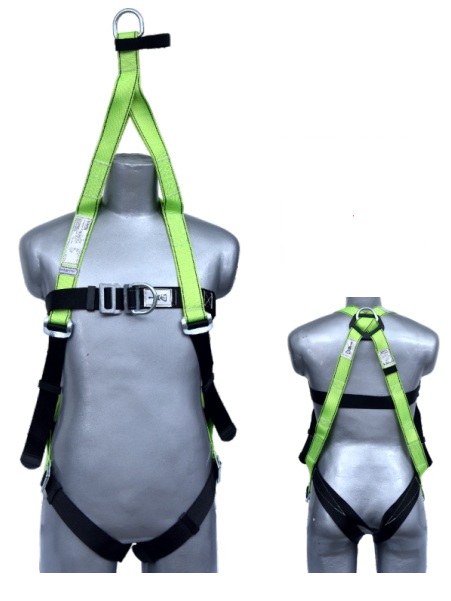 Cinturão de segurança tipo paraquedista confeccionado em fita sintética com proteção UV com 44 mm de largura na cor verde vivo para os ombros e na cor preto para as pernas. Extersor dorsal com 2 pontos de conexão para resgate em altura e espaços confinados – Equipado com indicadores de impacto – Equipado com fita de proteção sub-pélvica usado como assento para melhor conforto – Possui quatros pontos de conexão sendo um ponto dorsal em argola tipo “D” em aço, duas argolas tipo “D” laterais e um ponto duplo peitoral em fita de poliéster de 44mm ambos pontos para retenção de queda. Possui cinco fivelas duplas em aço, utilizadas para ajustes através de passadores sendo uma na fita peitoral, duas nas pernas e duas nas alças dos ombros garantindo o perfeito ajuste. Certificações : CA INMETRO – EN361/2002